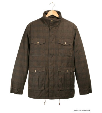 Cette pièce se distingue par son coloris extérieur "Baron", arborant une impression à petits carreaux (marron foncé et marron clair). L'esthétique est rehaussée par des surpiqûres contrastées couleur beige cuivré, apportant une touche de raffinement. La fermeture centrale est assurée par un zip robuste dissimulé sous une patte à boutons-pression, garantissant une isolation optimale contre le vent.