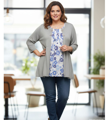 Pull gris femme effet 2 en 1 – Fleurie & boutons fantaisie